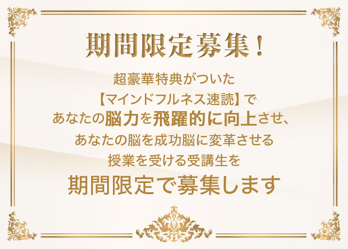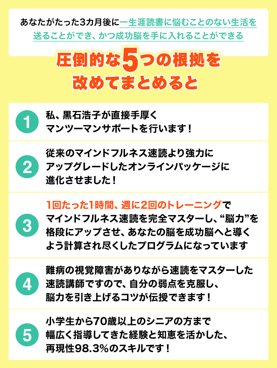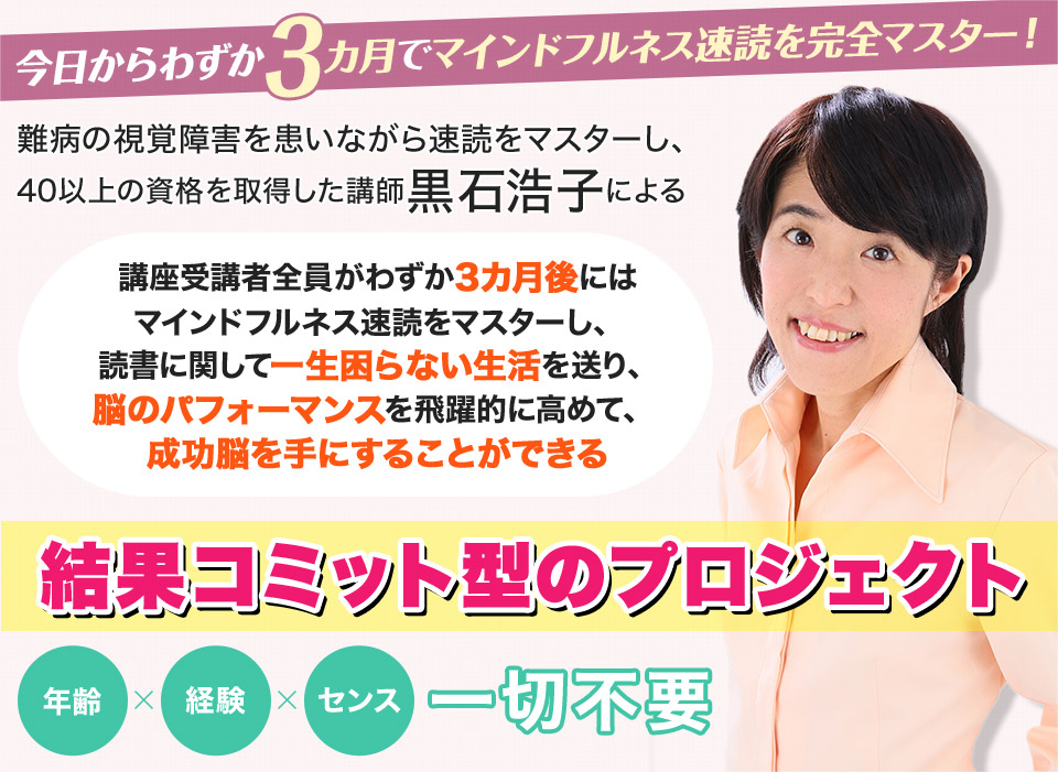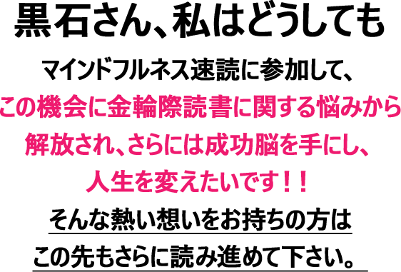 【超豪華7大特典】 特典1 苦手なジャンルの本でも速読できてしまう裏技 特典2 読書でスキルアップするために必要な3つのポイント 特典3 心身を整えるマインドフルネス3ステップ徹底解説 特典4 マインドフルネスインストラクターがコッソリ伝授する瞑想状態を保つコツ 特典5 ストレス解消に効果絶大!幸福度が200%になる読書療法のやり方 特典6 黒石式資格取得テクニック 特典7 マインドフルネス速読を使った受験や試験の対策法 【初日お申し込み特典】 マインドフルネス速読受講パーフェクトガイド(動画プレゼント) 【3日間限定特典①】 速読グループトレーニング参加権(月1回 60分/回) 【3日間限定特典②】 マインドフルネス実践会参加権(月2回 30分/回) 【3日間限定特典③】 オンライン読書会参加権(月1回 60分/回) 【先着100名様特典】 たった3ヶ月で速読がマスターできるだけでなく、逆境にも折れない心や成功脳を手に入れるための裏技を暴露するスタートアップWEBセミナー(動画プレゼント) |