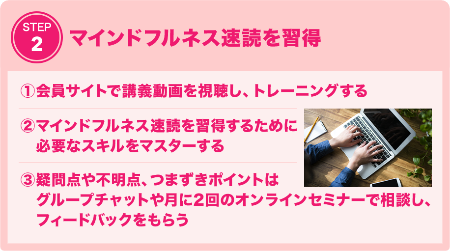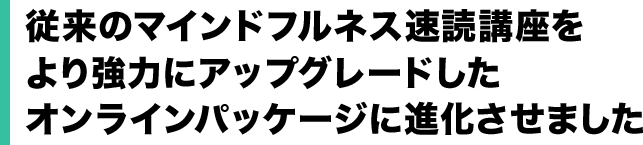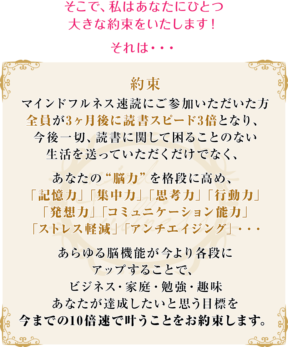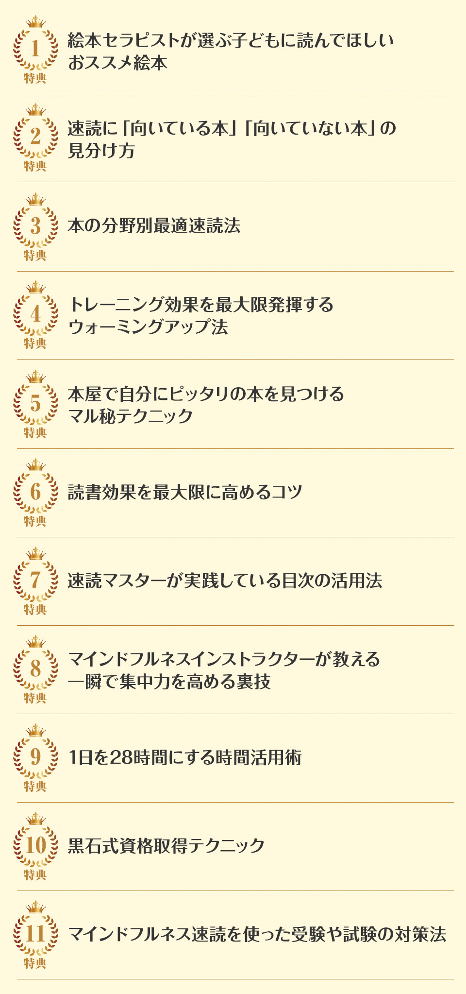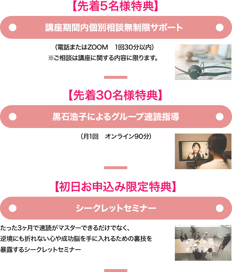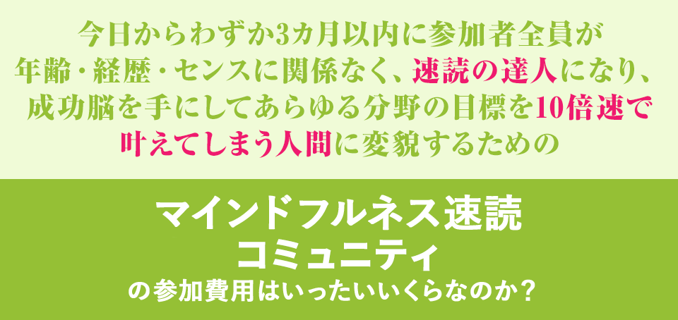 1:【マインドフルネス速読】会員サイトにて、 全26回の特別トレーニング動画公開 2:マインドフルネス速読会員サイトにて、トレーニング補助テキスト配信 (講義動画・補助教材は会員サイトに全てアップされています) 3:会員限定Facebookグループご招待 4:月1回オンラインセミナー参加権 |