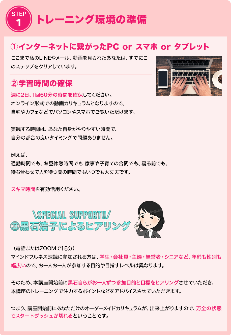 | 購入後の流れについて | ・本編のサポート期間はご入金が確認でき次第、ご案内から3か月間になります。 ・会員サイトのお渡し、Facebookグループご招待など受講に関するご案内は、ご入金から3日以内に受講生限定LINEまたはメールでご案内致します。 ・また、Facebookグループのサポート期間も3ヶ月間となります。 ・会員サイトはご受講開始日から半年間閲覧可能です。 |