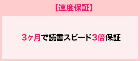 【読書スピード3倍保証】 3ヶ月で読書スピードが3倍を保証します。 【延長保証】 3ヶ月で読書スピードが3倍にならなかった方は、サポート期間終了後も、3倍になるまで無期限サポート延長します。 ※以下の条件をすべて満たした場合、サポート延長を承ります。 1.お客様が、全ての講義動画を適時に実践し、記録シートを全て提出いただくこと。 2.お客様が、トレーニング効果が出ないことについて、講師に迅速にご相談いただくこと。 3.上記のご相談に対して講師が行った提案内容をお客様が実践したこと。 4.それでもなお、お客様の読書スピードアップがみられないことについて、サポート期間終了日までに、弊社にメールにてご連絡を頂いたこと。 5.お客様の読書スピードアップがみられないと弊社が判断したこと。 |