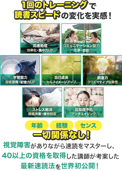 たった1回のトレーニングで98%以上が読書スピード2倍となる指導実績をもつ。